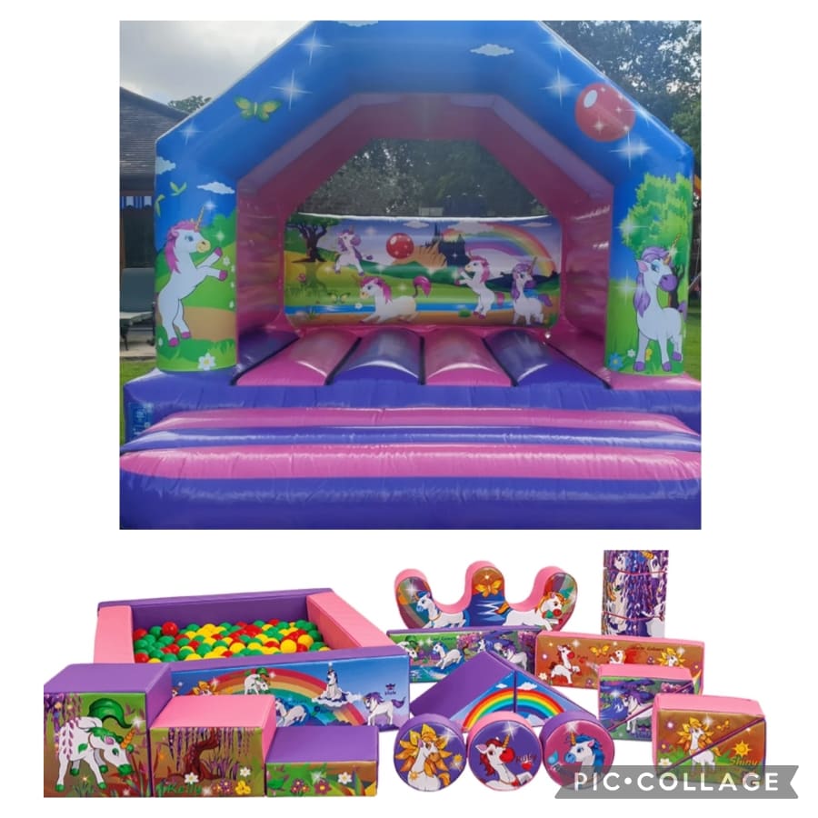 Our Unicorn bouncy castle Party Package with soft play and ball pit is available for indoors hire in Essex.