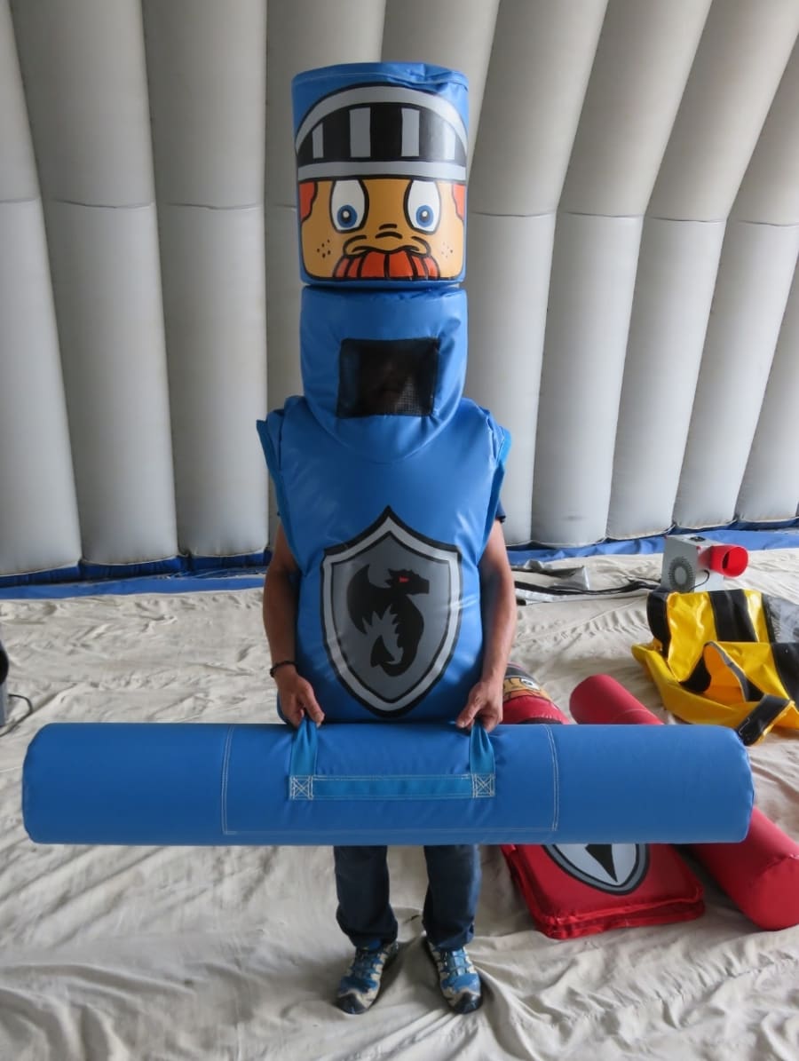 These are hilarious fun for both the participant and spectators. You wear the suit standing at around 8 feet tall and fight each other with the soft batons included and be the first to knock off your opponents head off wins. The heads are fastened on with Velcro.