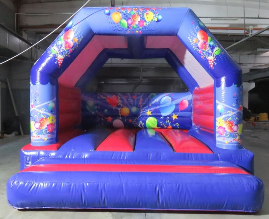 This bouncy castle makes a great presence at any party with it red bed and bright balloon artwork.