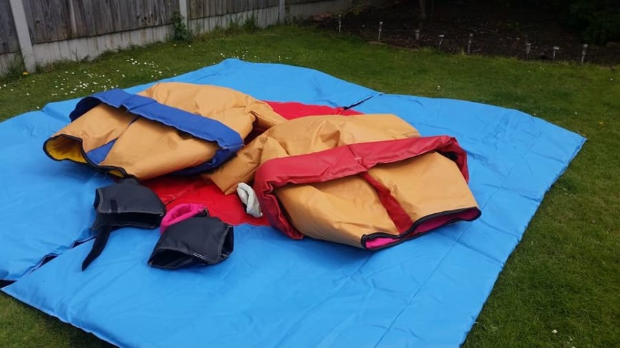 Padded sumo mat, 2 x suits, 2 x neck braces and 2 x head gear.