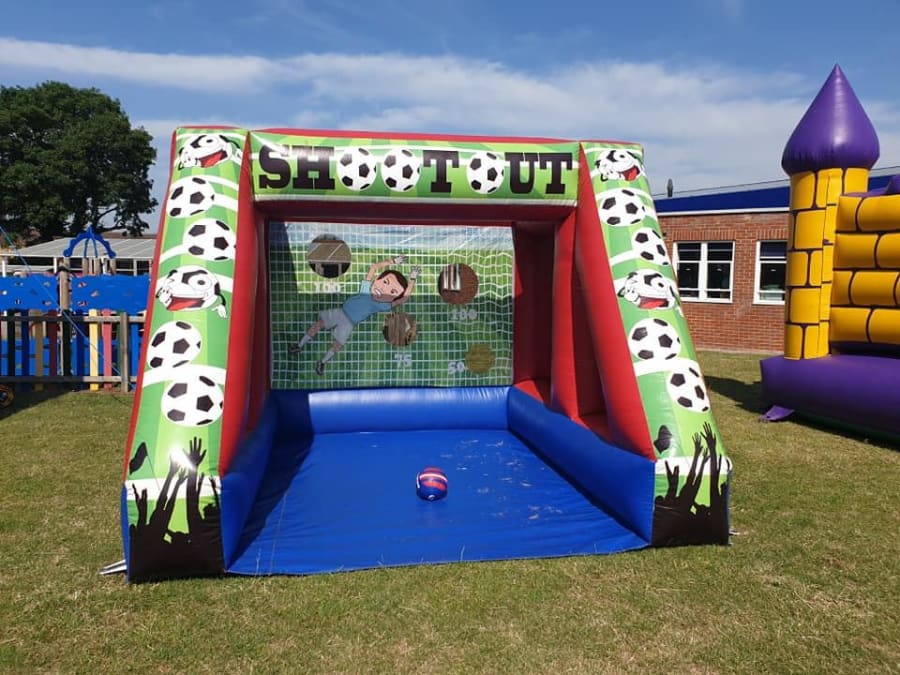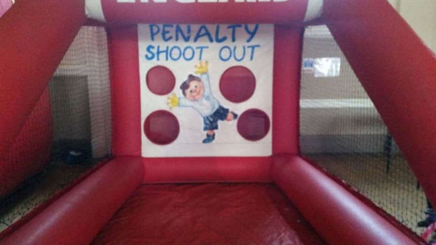 Size 9 feet wide 12 feet deep. Supplied with a football. Ideal for the garden, fetes and corporate events.