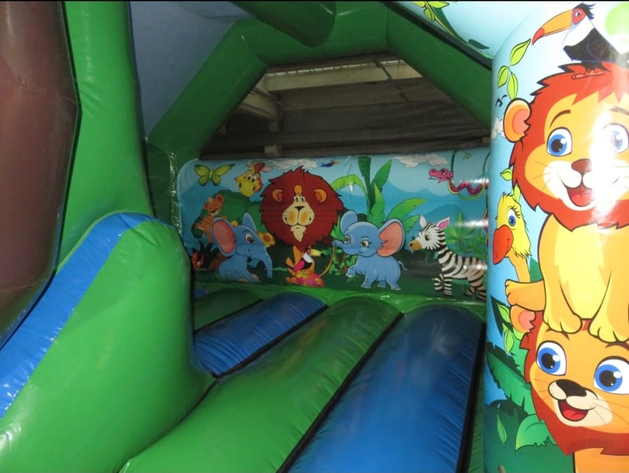 Our Jungle Bouncy Castle with Front Slide is bright and colourful with artwork depicting Jungle Characters including a 3D Lion head at the top of the slide.