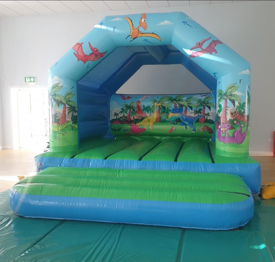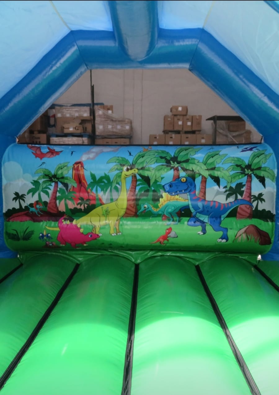 Our Dinosaur Bouncy Castle is bright and colourful with artwork depicting fun dinosaur characters.