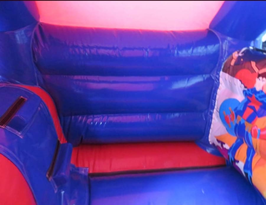 Superhero Bouncy Castle with Front Slide available for hire in Essex.