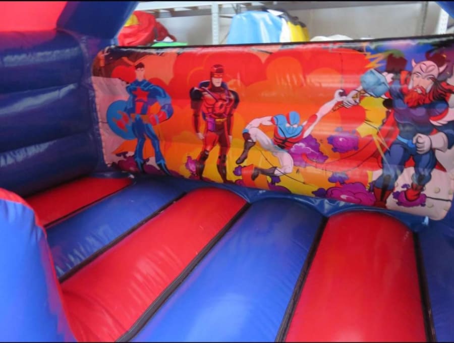 Our Superhero Bouncy Castle with Front Slide is bright and colourful with artwork depicting Superhero Characters.