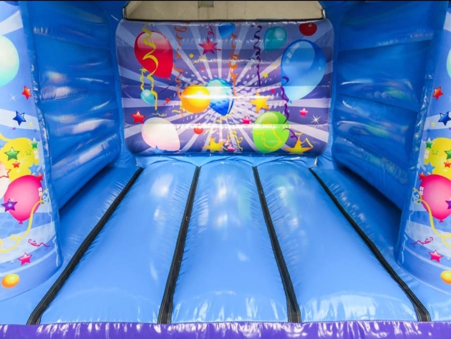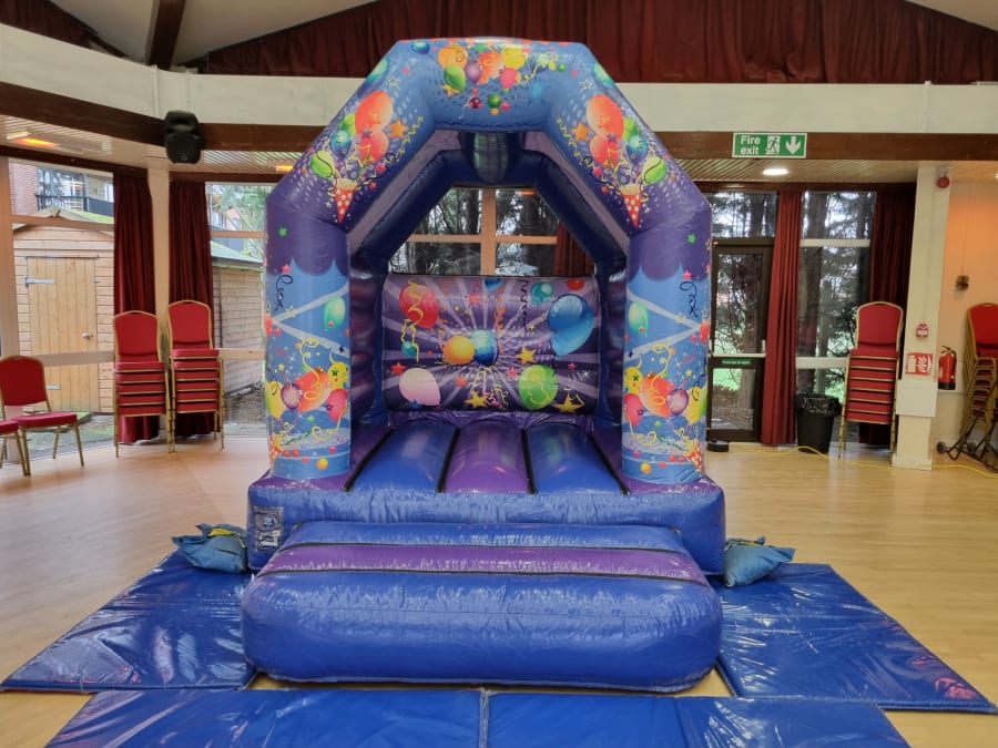 Party time purple and blue themed bouncy castle