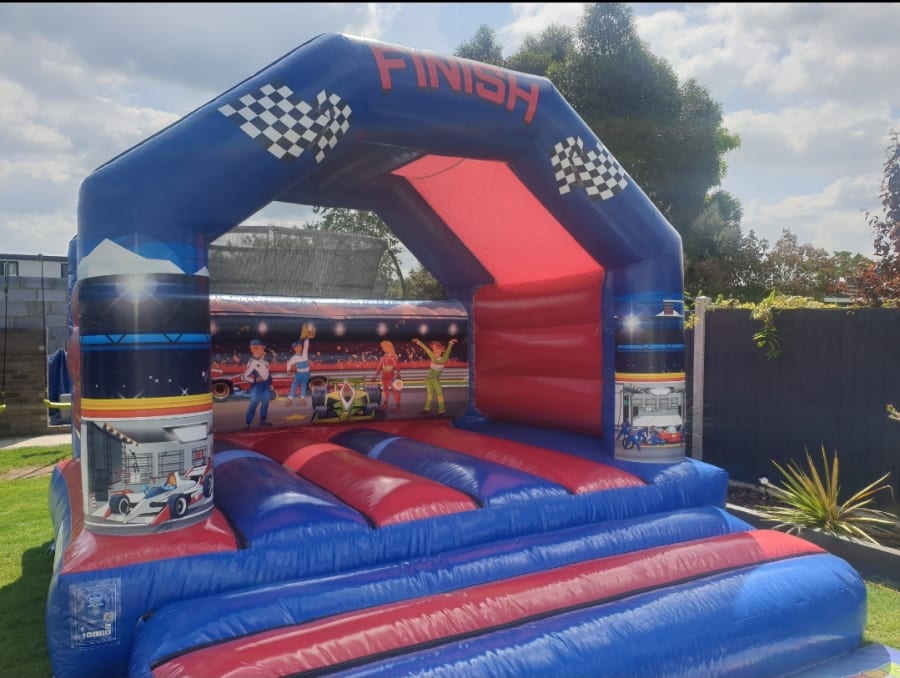 This bouncy castle makes a great presence at any party with its bright racing car artwork.