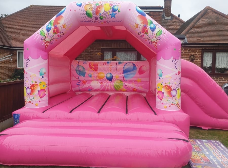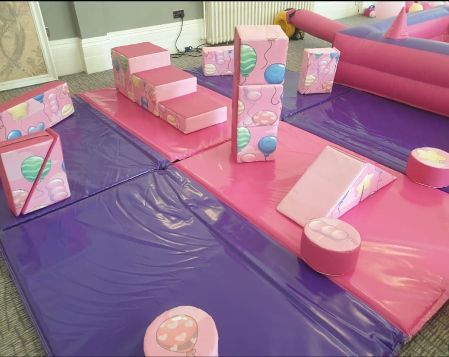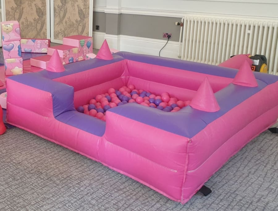 Our Pink Party Bouncy Side Slide Package with bouncy castle, slide, soft play and ball pit is available for indoors hire in Essex.